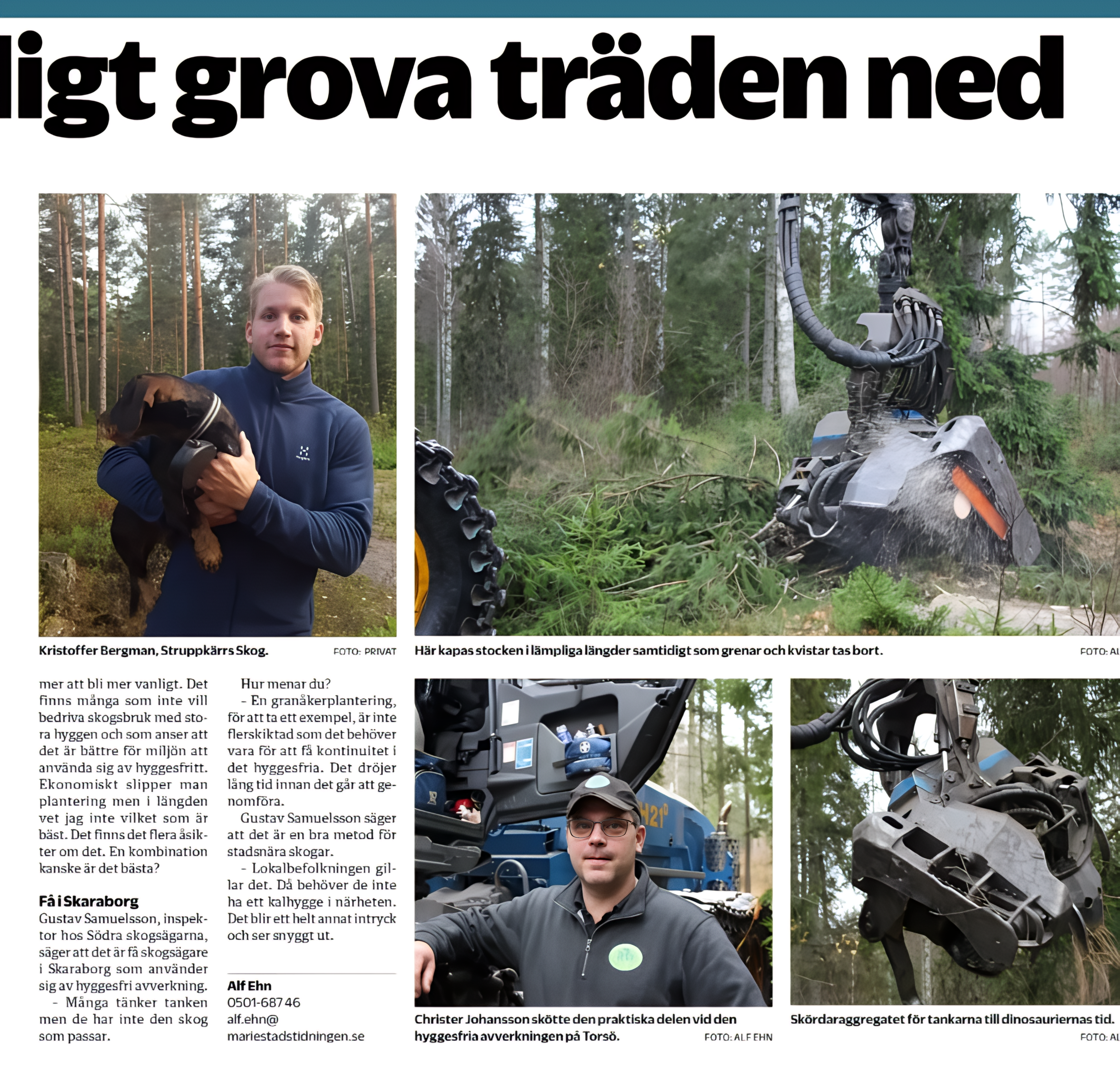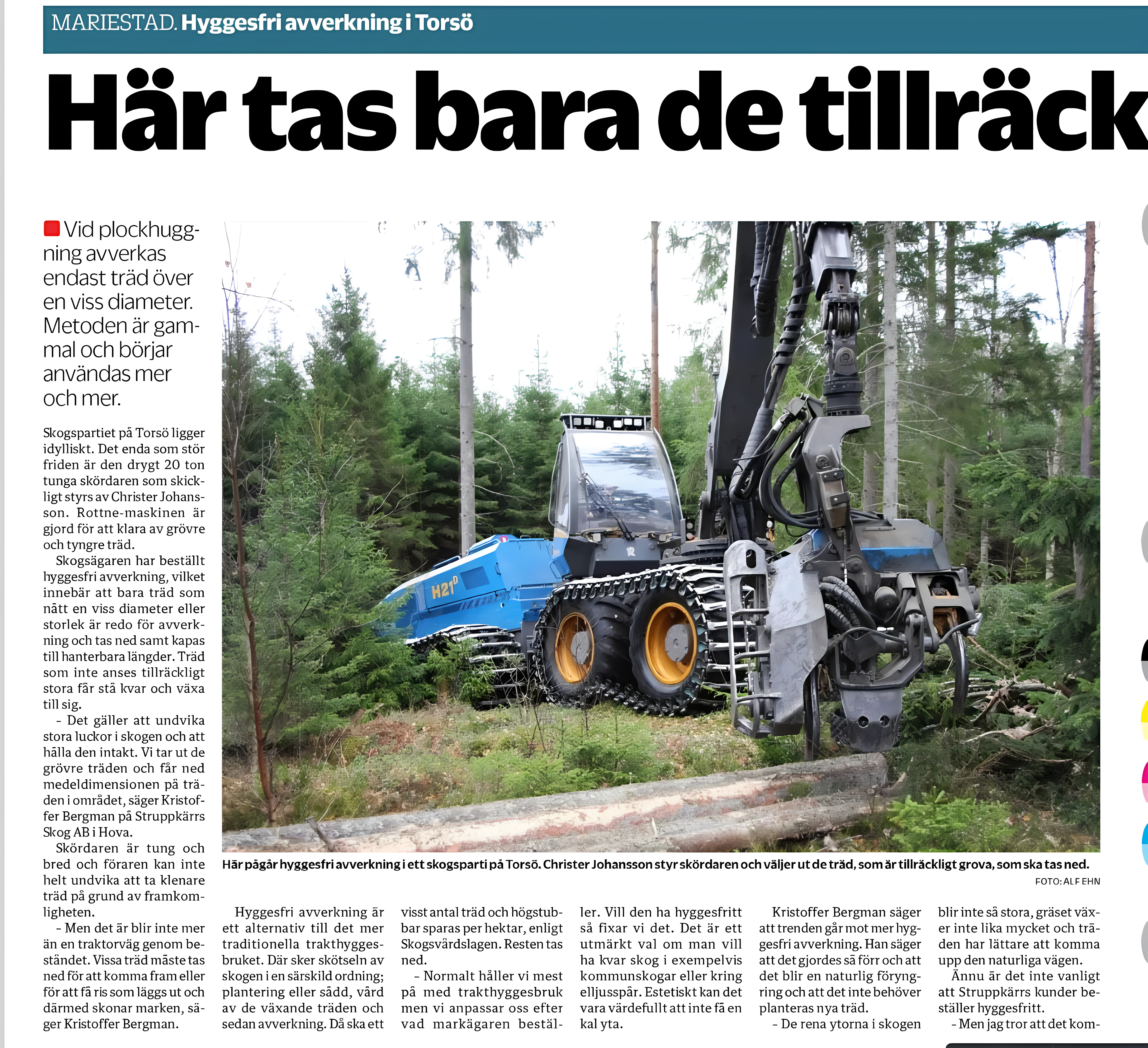 Läs nedan artikel publicerad i Mariestads tidningen den 20241120 om Struppkärrs Skogs arbete med plockhuggning på Torsö.